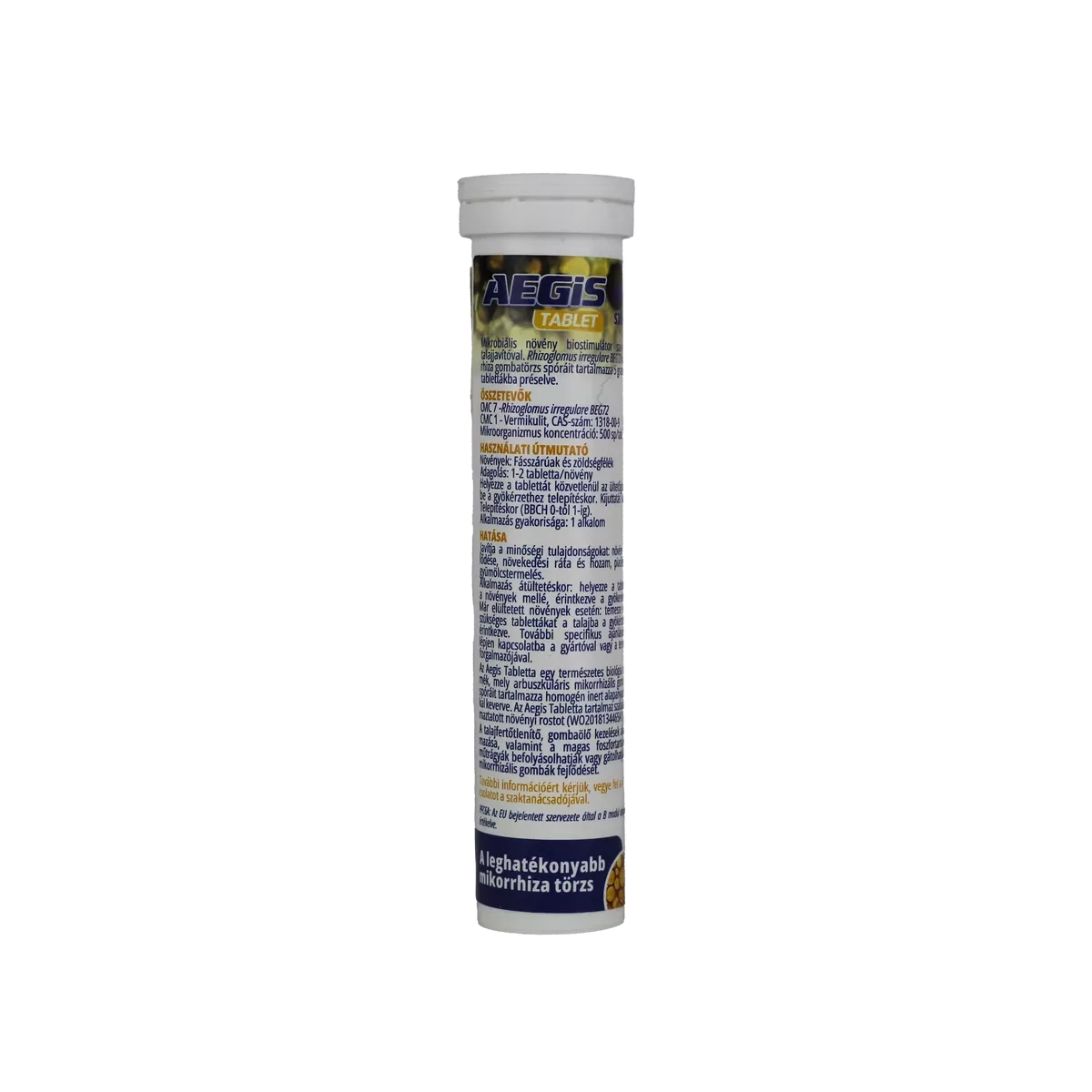 Az Aegis Tablet egy speciális, tabletta formájú talajélet-javító készítmény, amely a Rhizoglomus irregulare BEG72 mikorrhiza gombatörzs 500 életképes spóráját tartalmazza tablettánként. Ezek a hasznos gombák természetes szimbiózist alakítanak ki a növények gyökérzetével, mely során egy finom gombahálózat fejlődik ki a gyökerek körül, megnövelve a gyökérfelületet, ezáltal hatékonyabb víz- és tápanyagfelvételt biztosítva.
