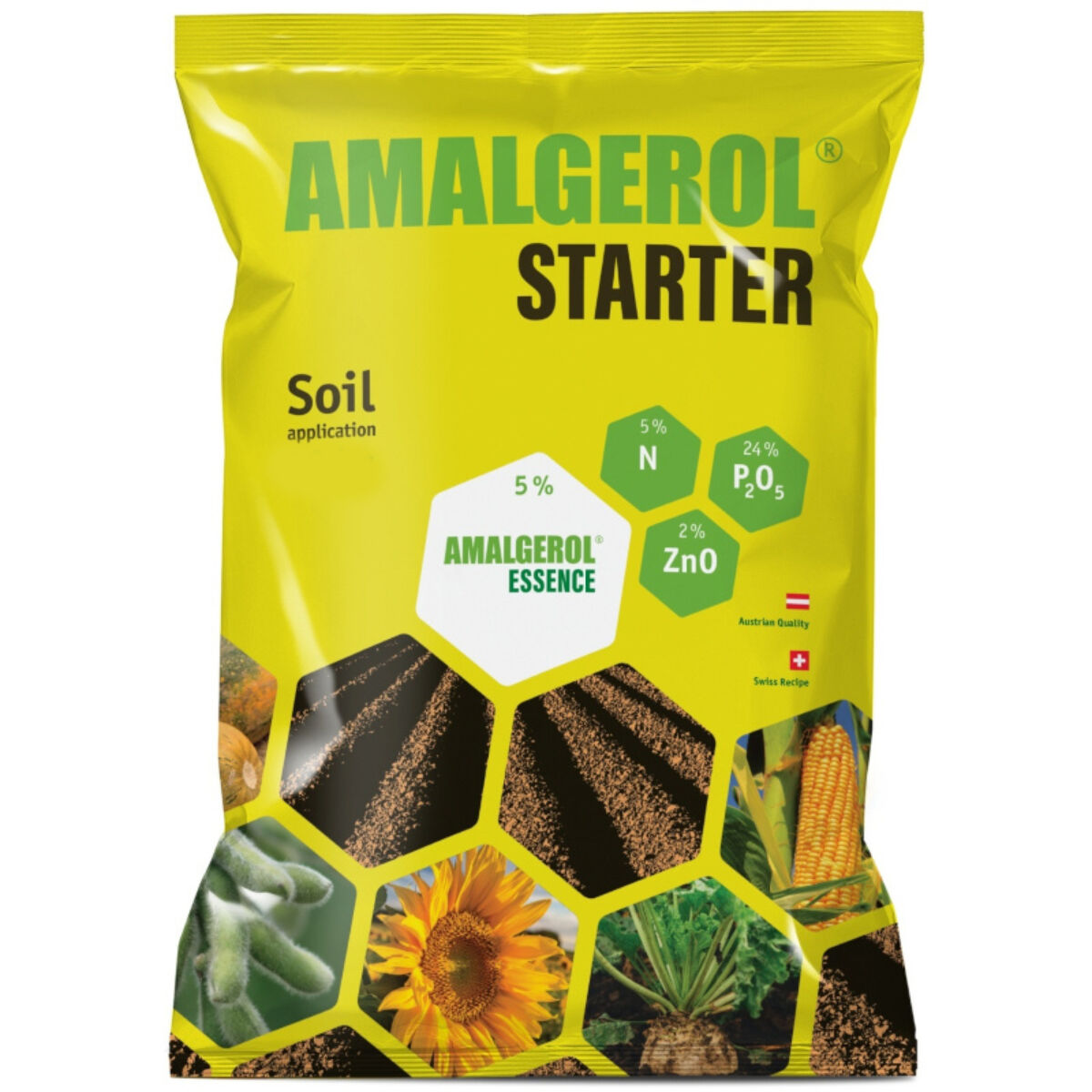 Az Amalgerol Starter (4% N; 24% P205; 2% K20; 1,25% S; 2% Zn; 5% Amalgerol Essence) különlegessége, hogy 5%-os keverék arányban tartalmazza az Amalgerol Essence mikrogranulált formulációját, amely hígítatlanul 100%-ban van jelen a termékben elősegítve a talaj mikrobiológiai életét, a tápanyag feltáródást és ezáltal a növény fejlődését. Különleges tulajdonsága, hogy a növények biokémiai folyamataihoz nélkülözhetetlen esszenciális aminosavakat tartalmaz. Ennek köszönhetően a növénynek nem kell külön energiát, tápanyagot, vizet mozgósítania az előállításukhoz, ezért az így megmaradt energia a növények ellenálló képességének, termés mennyiségének és minőségének növelésére fordítódik. Az Amalgerol Starter-ben a tápelemeket tartalmazó mikrogranulált műtrágya mellett fajsúly egalizálással (homogenitás) az Amalgerol Essence mikrogranulált formulációja van jelen a 20 kg-os kiszerelésben.