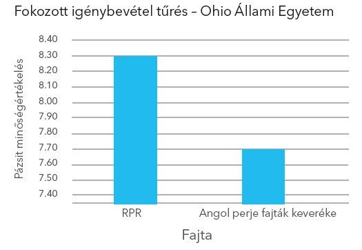 A fenti grafikon kettő RPR fajta átlagát veti össze egy angol perje keverékkel, három napnyi fokozott igénybevétel után. A vizsgálat időpontja: 2008. szeptember. Az adatok forrása: The Ohio State University, P.J. Sherratt, John R. Street and A. Drake.