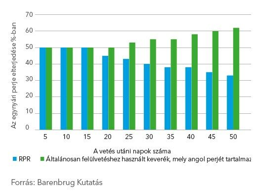 Ezen a képen világosan látszódik, hogy az RPR egy év alatt 50%-kal nagyobb területet fed le, mint a közönséges angol perje.