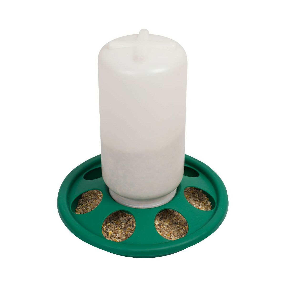 1 kg kapacitású önetető vagy önitató, erős műanyag kivitellel. A tartály könnyen lecsavarozható, feltölthető és visszacsavarozható. A 7 lyukon keresztül tud a baromfi táplálkozni vagy inni, ezek a lyukak biztosítják, hogy ne tudja az eleséget kikaparni, az ne vesszen kárba.
