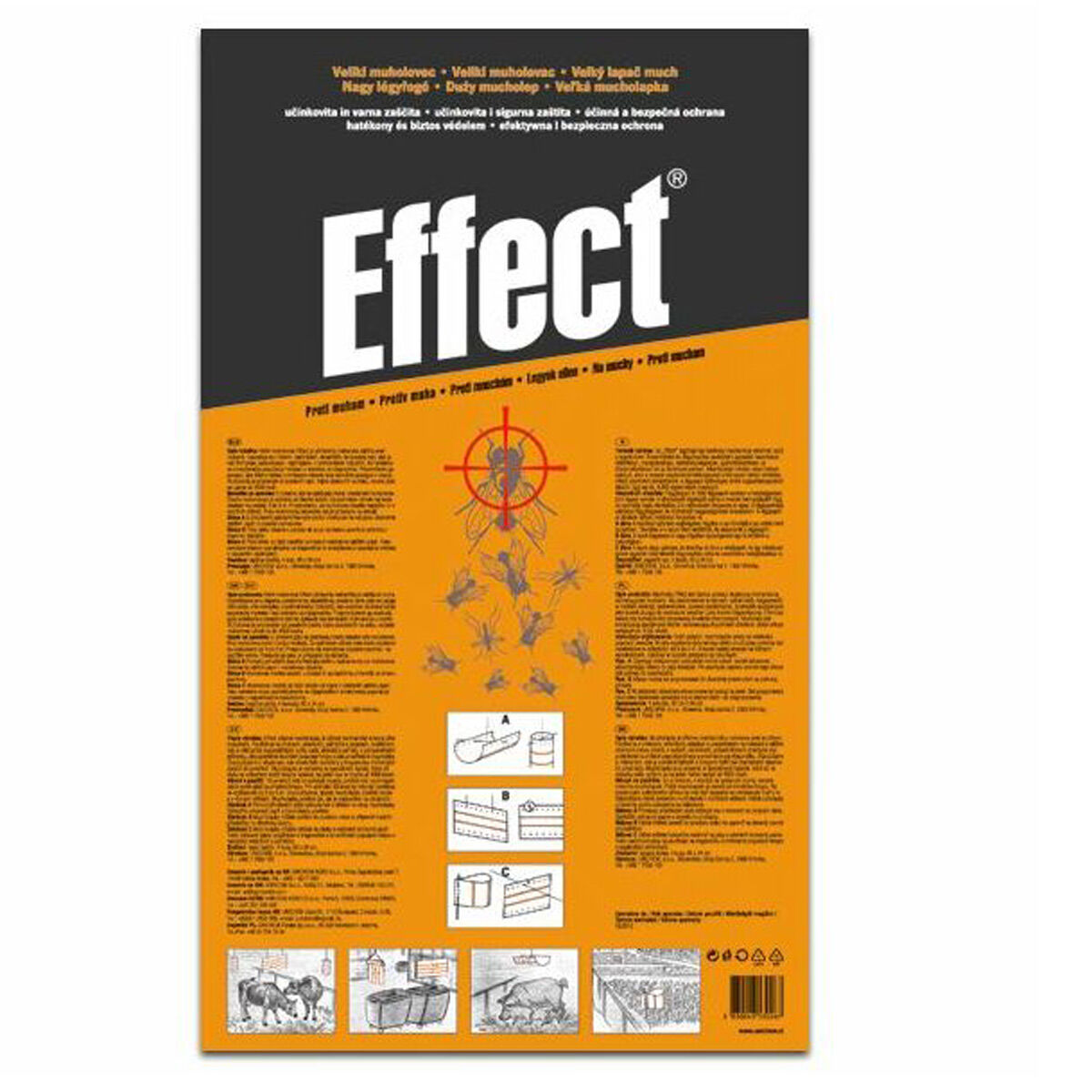 Az „Effect" légyfogó lap hatékony mechanikus védelmet nyújt a legyek ellen. Rovarirtóként és diagnosztikai eszközként egyaránt használatos istállókban, melegházakban, raktárhelyiségekben, gyümölcsösökben, az állattenyésztésben és az élelmiszeriparban. Alkalmazását minden olyan helyen ajánljuk, ahol a rovarok okozta kellemetlenségeket a környezet kémiai terhelése nélkül szeretnénk kiküszöbölni. A légypapír különleges, tartós ragasztóanyagokból készült.
