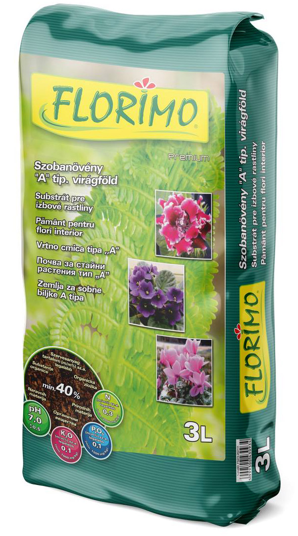 FLORIMO® szobanövény A típusú virágföld 10 L (pH. : 5.4-5.8) Laza szerkezetű, barna színű, vegyszerektől mentes termesztő közeg. Tápanyag ellátottsága, levegő háztartása megfelel minden növény számára. Nagyobb levegőző-képesség, jobb vízháztartás, még több tápanyag a virágzás érdekében. Alapanyagok: Shagnum moha tőzeg, síkláp tőzeg, biohumusz, agyag Savanyú virágföldet kedvelő növények: Afrikai ibolya Alokázia Ananász Begónia(leveles) Calathea Flamingo Gardénia Gloxinia Hortenzia Ixóra...