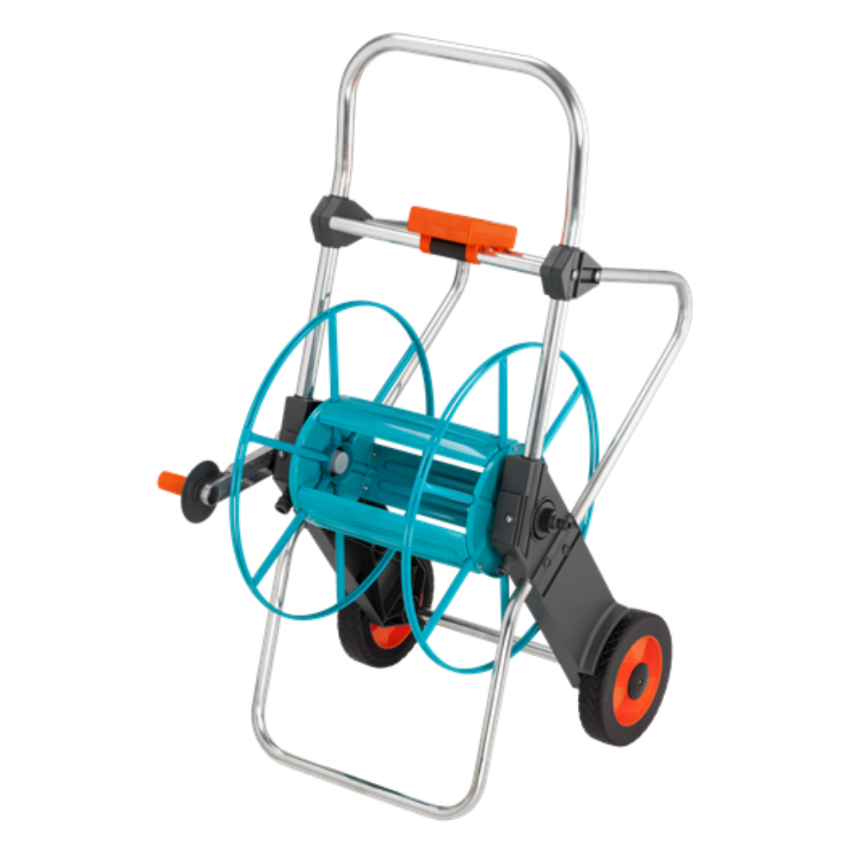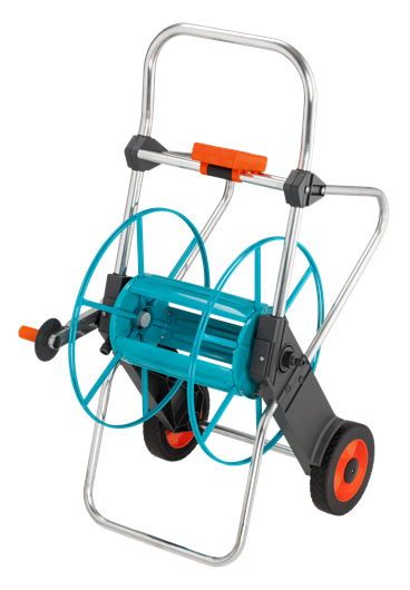 Az erős fém tömlőskocsi különösen alkalmas a hosszú tömlőkhöz. Rendkívül stabil, porbevonatos fémdobjára 100 méter 13 mm-es (1/2"), 80 méter 15 mm-es (5/8"), 50 méter 19 mm-es (3/4") vagy 25 méter 25 mm-es (1") tömlő csévélhető fel. A fémdob feletti tömlővezető és a szabadon futó tekerőkar megkönnyíti a tömlő rétegszerű felcsévélését. A széles kengyel nagy stabilitás biztosít álló helyzetben, a maximális stabilitás érdekében azonban a kocsi le is fektethető.