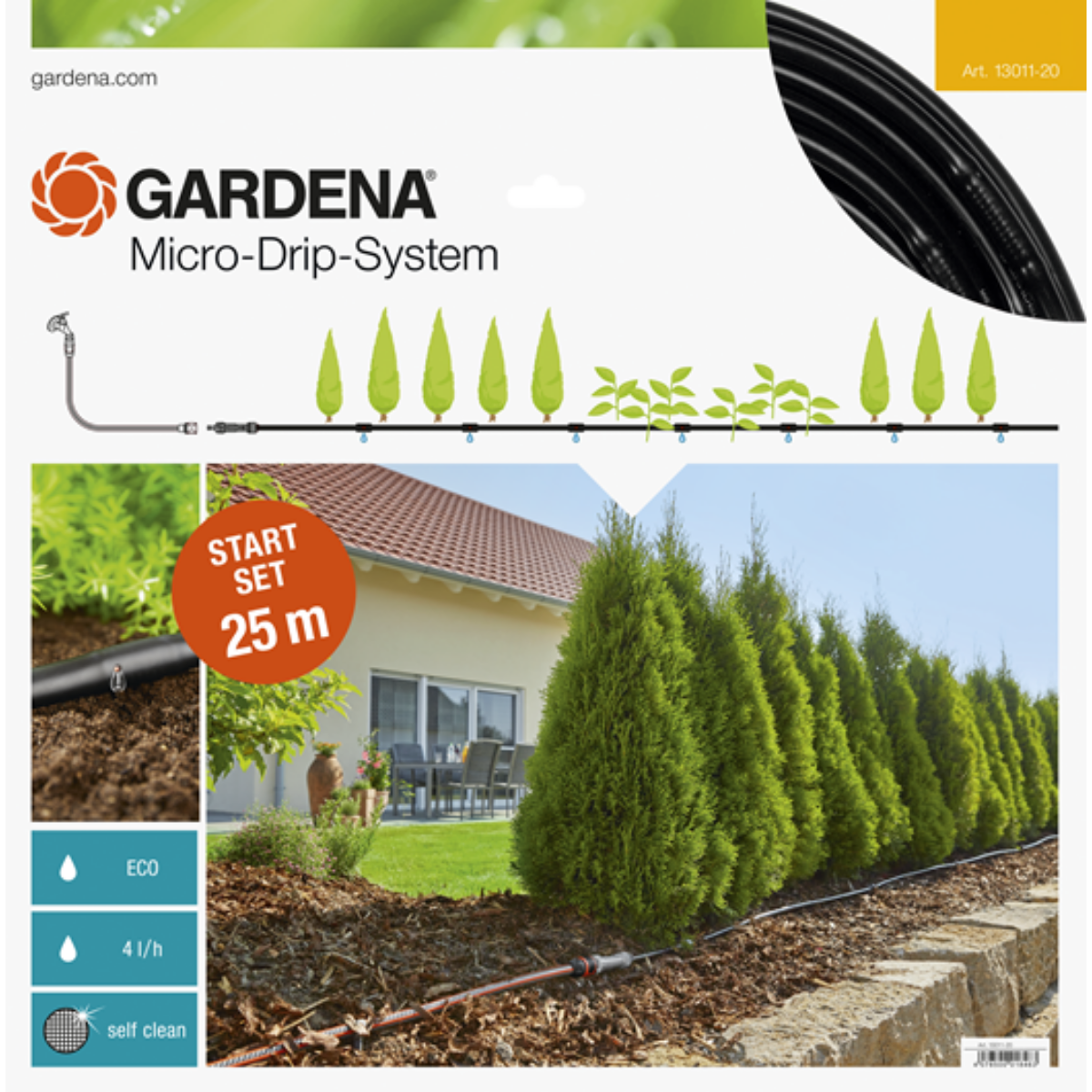 A GARDENA Micro-Drip-System Indulókészlet növénysorokhoz M méret használható növénysorok kényelmes és víztakarékos öntözéséhez. A nyomáscsökkentő alapelem a vezetékcsővel csatlakoztatható a vízcsaphoz. A csepegtetőcsövön 30 cm-ként találhatók az öntisztító csepegtetőfejek, amelyek lehetővé teszik a sövények és bokrok egyenletes öntözését. Tartalma: 1x alapelem 1000 25 m csepegtetőcső 13 mm (1/2") 15x leszúrótüske 13 mm (1/2") 1x záródugó 13 mm (1/2")