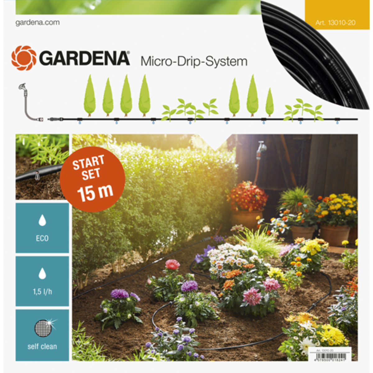 A GARDENA Micro-Drip-System Indulókészlet növénysorokhoz S használható rövid növénysorok és érzékeny konyhakerti és dísznövények (pl. paradicsom) kényelmes és víztakarékos öntözéséhez a gyökereknél.