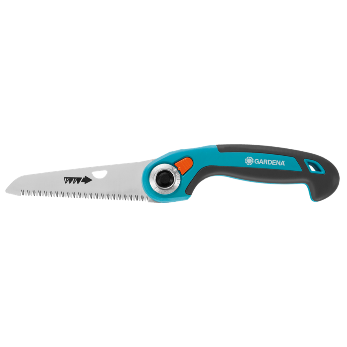 Ezt az ügyes összecsukható fűrészt bárhová magával viheti a kertben, például biztonságosan lezárva és összecsukva berakhatja a nadrágzsebébe, vagy az övére kötheti. Amikor szüksége van rá, egyszerűen nyissa ki a hüvelykujjal megnyomható gombbal. A fűrészt a biztonsági gombbal három állásban rögzítheti. Amikor nincs szüksége a fűrészre, csukja be újra. A fűrész éle eltűnik az elegáns formájú fogantyúban.