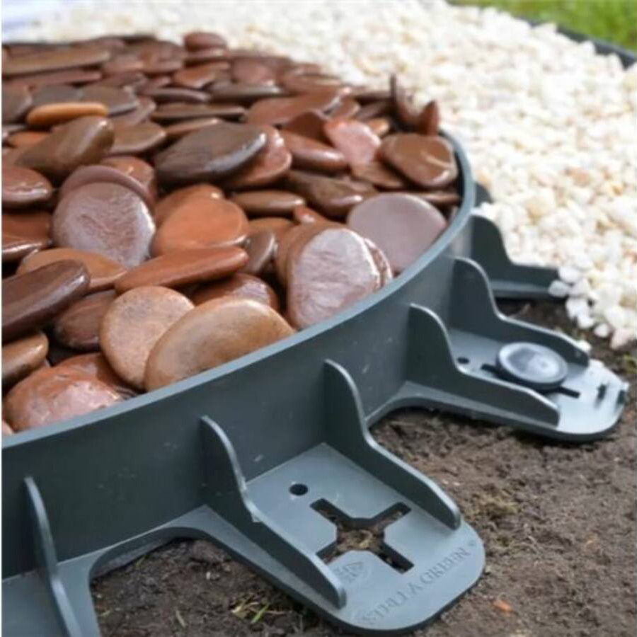 A tüskékkel rögzítse a szegélyt, majd helyezze rá a földet, kavicsot, gyepszőnyeg szélét stb.