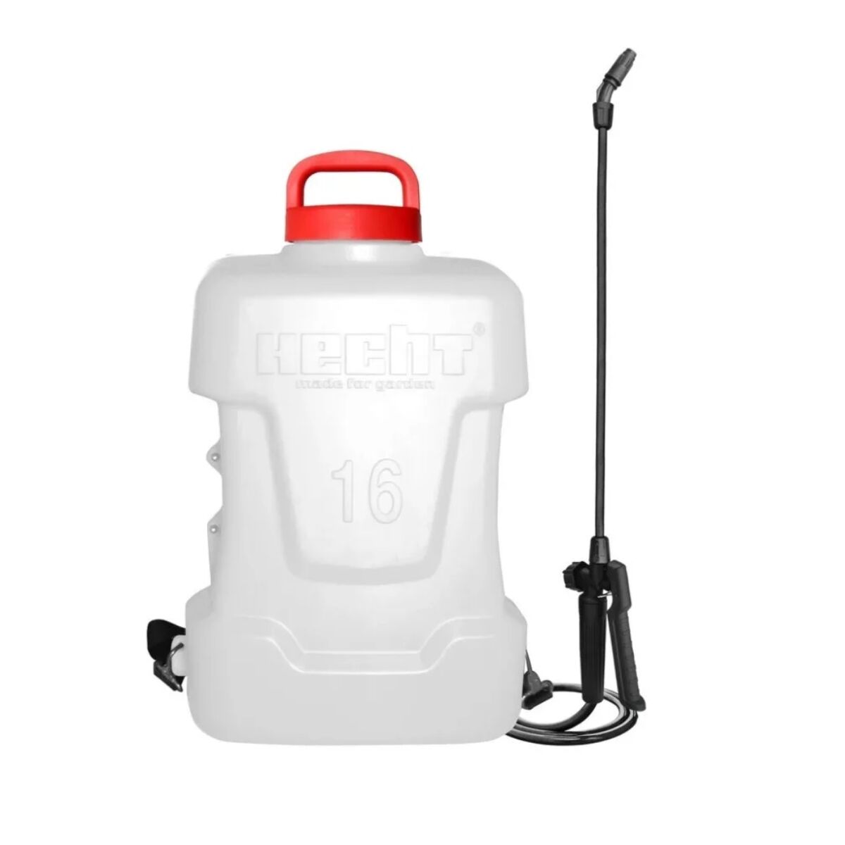 Hecht 416 Accu vállra akasztható háti elektromos 16 literes műanyag permetező - permetszóró - permetezőgép. A permetező fejszóró szögét csavaró mozdulattal tudja állítani. Feltöltés után szabadon használható.  Súlya 6 kg. Űrtartalma 16 liter, átfolyás 3,1 L/perc. Töltés 12V/8Ah