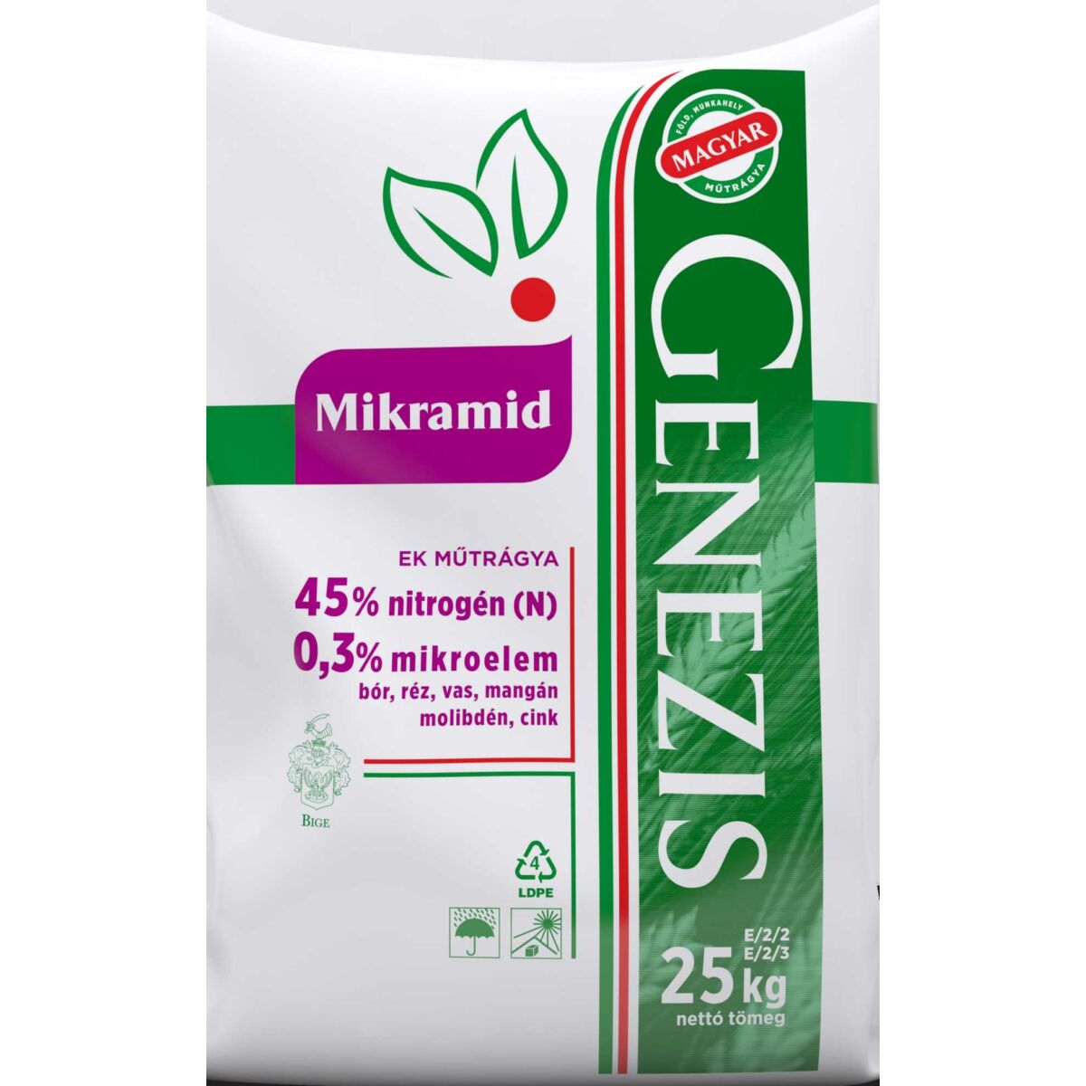 Tápanyagtartalom: Nitrogén : 45 s% Kelatizált mikroelemek: (vas, réz, cink, mangán, molibdén és bór) 0,3 s% Használatának előnyei - Az amid kötésű nitrogén gyökerén és levelén át gyorsan felszívódva közvetlenül beépül a növekedésben fontos szerepet játszó aminosavakba - A nyomelemek hatására élénkül a klorofill képződés - Minden talajtípuson alkalmazható - Vízben tökéletesen oldódó műtrágya - Káros perzselést nem idéz elő a leveleken - Növényvédelmi kezelésekkel egymenetben is hatékonyan kijuttatható Felhasználási javaslat: -Talaj -illetve fejtrágyaként: 100-200 kg/ha Mikramid, amely kiszórása a szokásos módon, a nitrogén műtrágyázás időpontjában történhet. -Lombtrágyaként javasolt oldat koncentráció: / 3-6 alkalommal a vegetációs időszak alatt / -Zöldségfélék 0,3-0,6 % -Káposzta, zeller 0,8-1,0 % -Kukorica 0,4-0,6 % -Burgonya 0,8-1,6 % -Cukorrépa 2,0-4,0 % -Sz?l?-gyümölcs 0,6-1,0 % -Rét-legel? 1,0-1,5 % A Mikramid szilárd formában keverhető más műtrágyakkal, növényvédő szerekkel. Oldat formában keverhető a legtöbb növényvédő szerrel.
