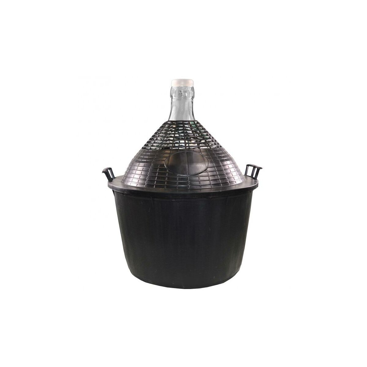 Olasz gyártású üveg demizson, levehető műanyagkosaras borítással. Demizsonüveg fehér áttetsző, ballonszáj vastag, törés védelmet a leszedhető kétrészes műanyag kosár biztosítja. A kosár színe a képen látható sötét színű. Az üvegballonhoz szállításvédő kupakot adunk. A demizson műanyag ruhája leszedhető.
