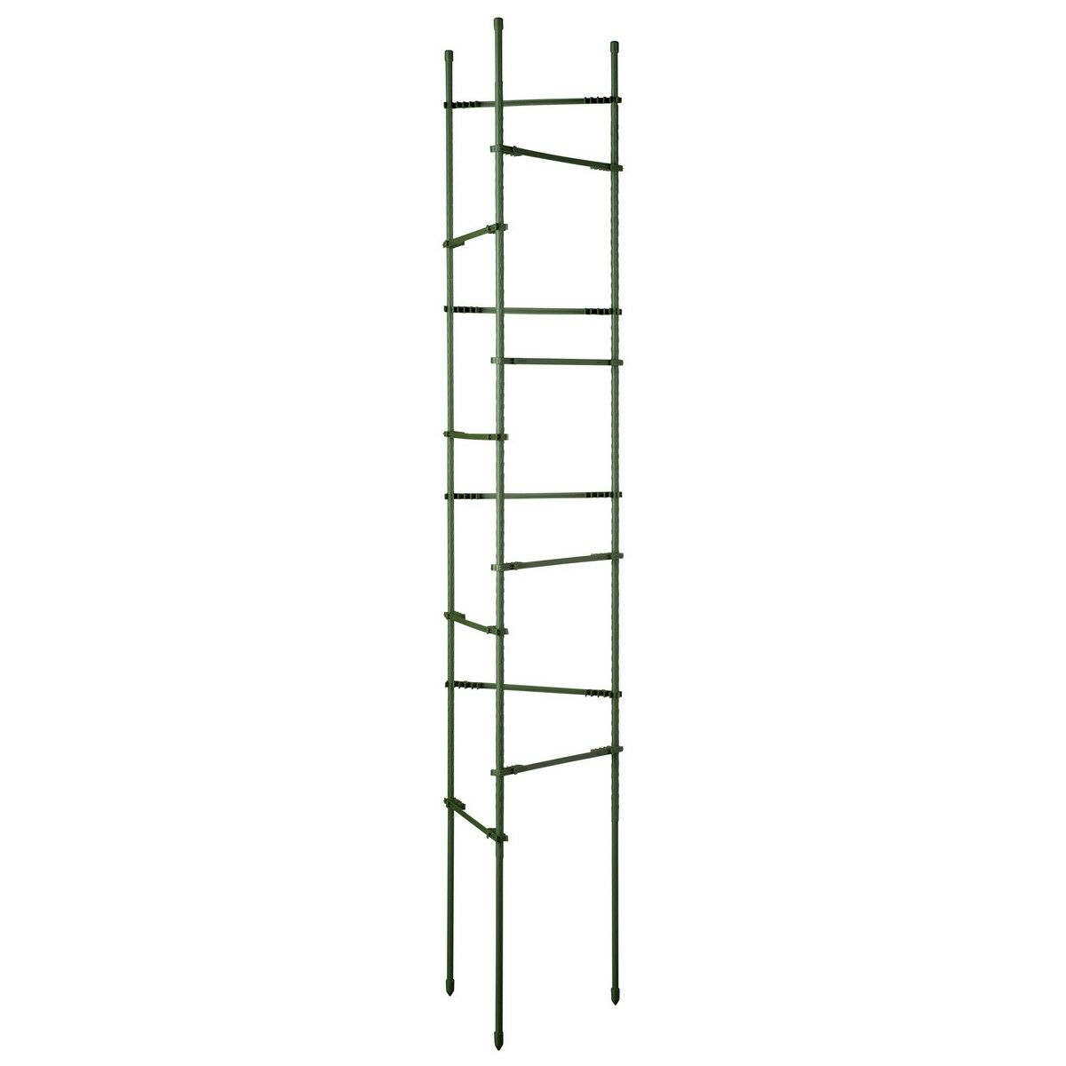Polietilén bevonatú acélból készült háromszögű növénytámasz zöld színben. 3 darab 150 cm magasságú, 12 keresztrúddal összekapcsolt