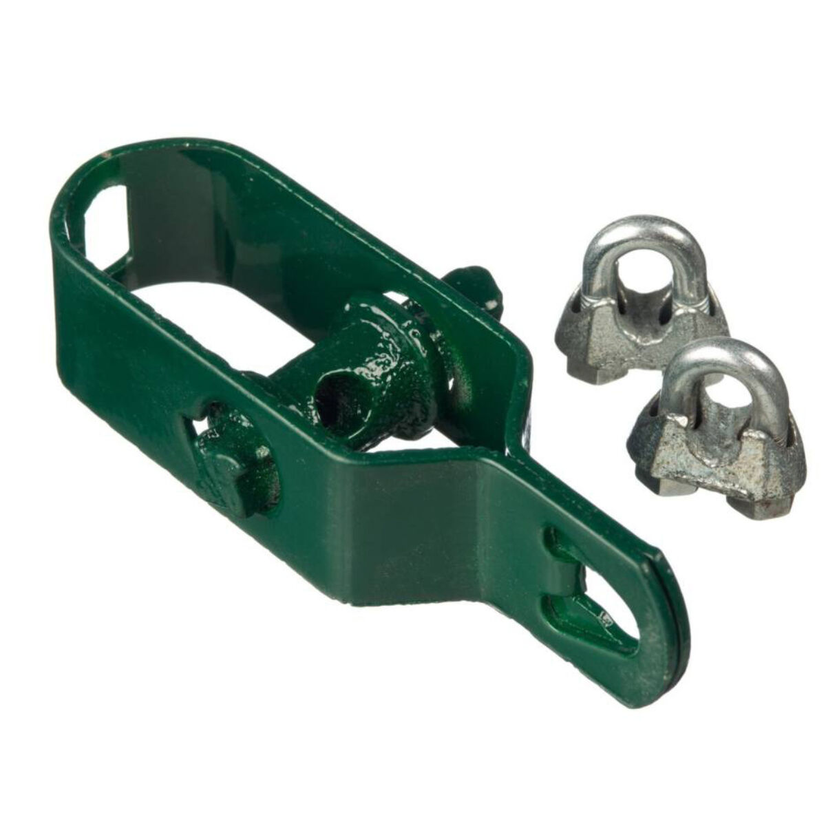Polietilén borítású horganyzott acélból készült zöld kötélfeszítő készlet. A csomag tartalmazza a 2 db kapcsot.