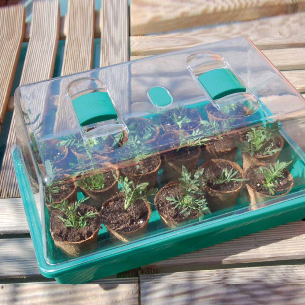 Lehetővé teszi, hogy a zöldségek és virágok megfelelő környezetben növekedjenek. A tetején két szellőző nyílás található. A Rapid Grow mini üvegház lehetővé teszi a magok gyorsabb csírázását, így hamarabb ki lehet ültetni a kertbe. Anyaga: PP, (polipropilén), Átlátszó fedele van, amin a két szellőző lyuk található. Helyezze fényes helyre, de ne a közvetlen napfényre.