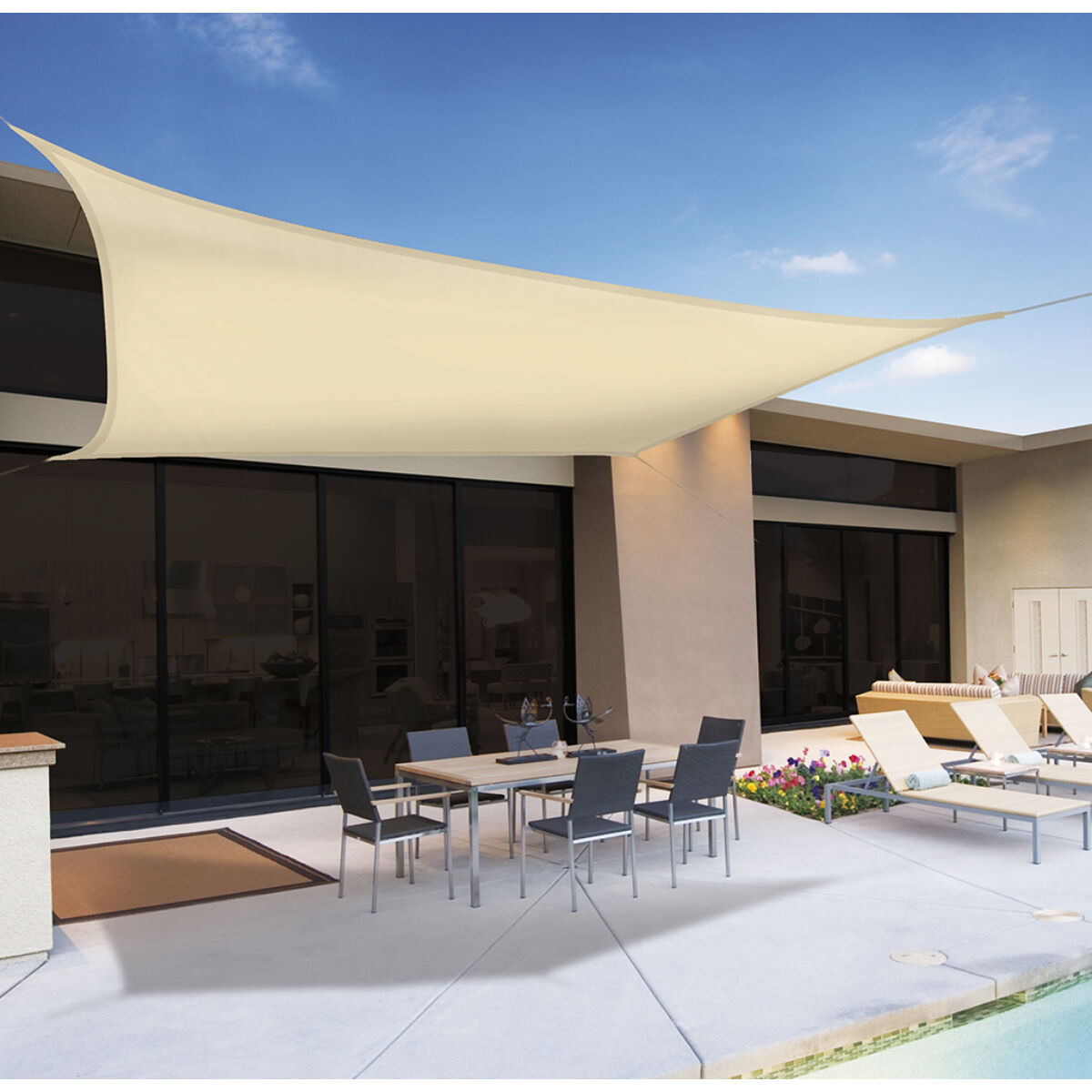 Napvitorla, amit ajánlott feszesen és kissé ferdén felhelyezni, hogy ne maradjon meg rajta az esővíz és a falevelek. Könnyű és egyszerű telepítés: Rögzítse a kötelet a szövet minden sarkának gyűrűire, húzza meg, majd rögzítse a másik végét a pálcákra vagy a fákra. A sarkok közül legalább az egyiknek alacsonyabbnak kell lennie, mint a többi, hogy az eső ne halmozódjon fel a napellenzőre (minimum 30 ° -os szögben).
