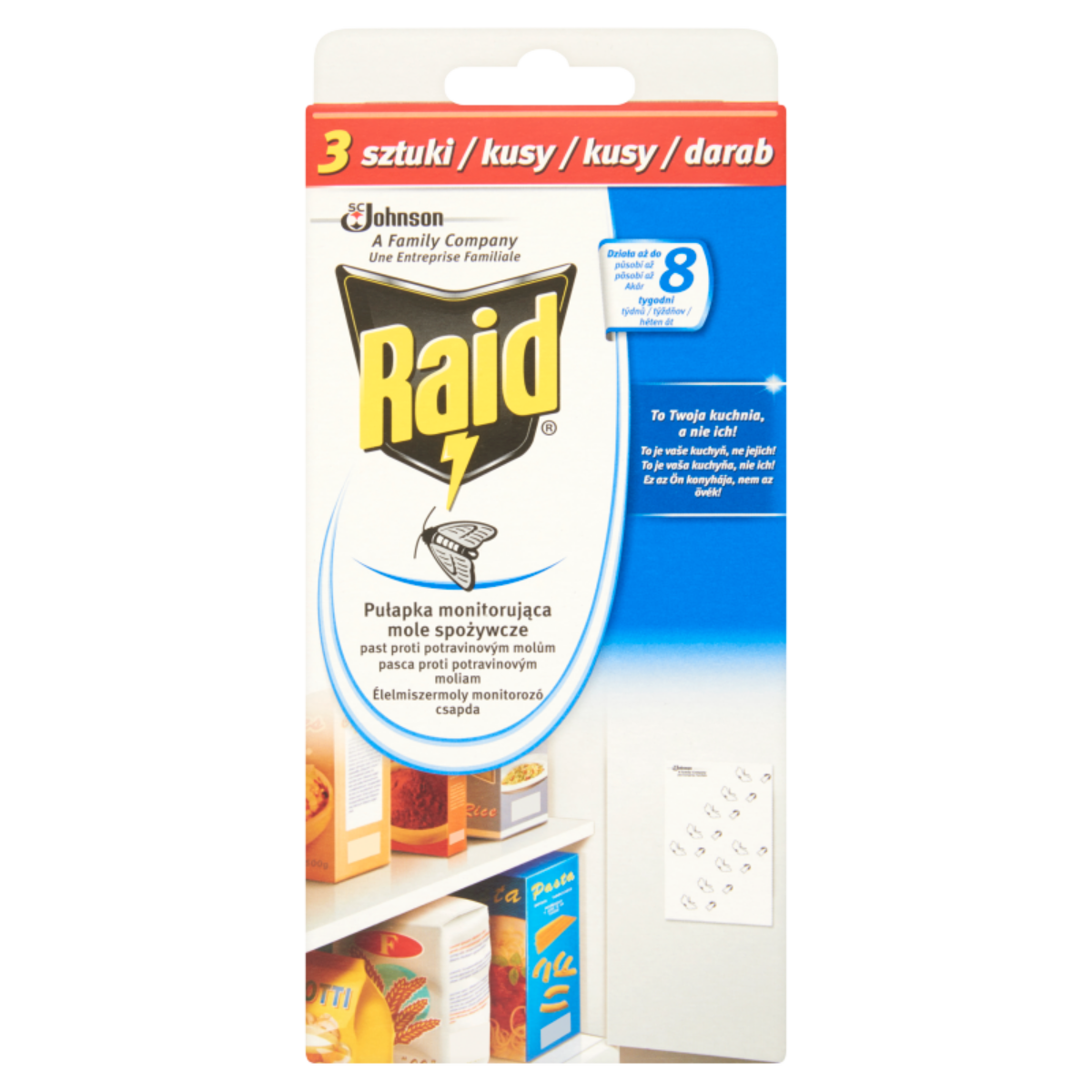 Jelzi az élelmiszermoly megjelenését a kamrában. Felnyitástól számított 6 hétig hatásos. A termék feromon tartalmú, mely a hím molyokat a termék ragacsos felületéhez vonzza, melybe bele tapadnak.