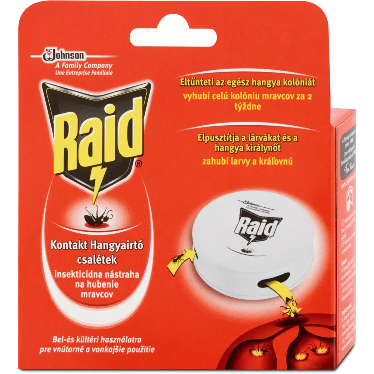 RAID Kontakt Hangyairtó csalétek ami hatásos védelmet biztosít a hangyák ellen a házban, az erkélyen vagy akár a terszán. A természetes rovarölő csalétket a dolgozó hangyák a bolyba szállítják, ahol a csalétek elpusztítja az egész hangyakolóniát. A csalétek néhány héten belül kifejti hatását az elterjedtség mértékétől függően. Nagyobb mennyisègben elterjedt hangyainvázió esetén és a maximális hatás érdekében használjon egyszerre több csalétket is.