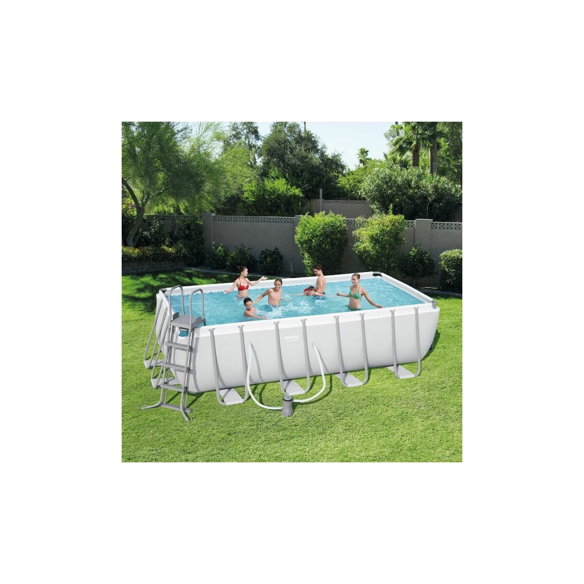 Az erős medence testet egy csőváz szerkezet tartja. Egyszerűen felállítható, színterezett acélvázas medence, extra erős újfejlesztésű PVC testtel.