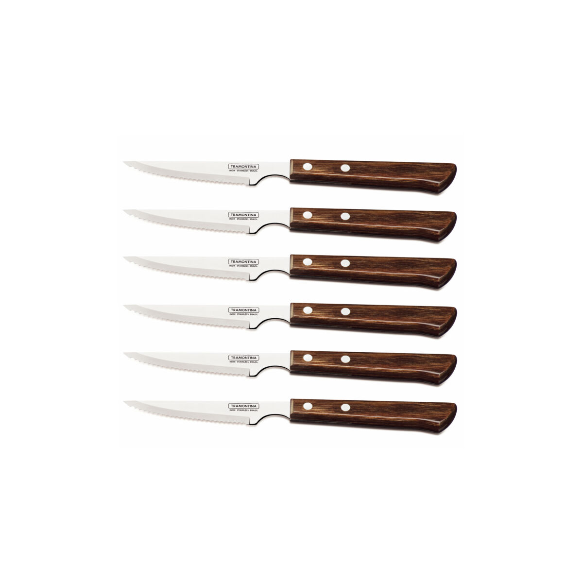 A TRAMONTINA steakkései nemcsak elegánsak és jól érzik magukat a kézben . Eredeti funkciójukhoz is kiválóan alkalmasak: a steakek és pizza könnyed darabolására . A penge finoman siklik át a lédús steakeken és a ropogós pizzahéjon. A tökéletes kiegészítő a jó ételek élvezetéhez és ünnepléséhez. A robusztus és kiváló minőségű rozsdamentes acél pengék tartós vágási élményt biztosítanak. A gyönyörű nyél FSC-tanúsítvánnyal rendelkező fenyőből készült , rétegesen megmunkálva és speciális gyantával impregnálva. A kések mosogatógépben moshatóak és tartósak. 6 steak kés "spanyol stílusú" Rozsdamentes acél Valódi fa fogantyúk, FSC minősítéssel Mosogatógépben mosható rozsdamentes acél szegecsek Tartós és robusztus teljes méretek fogantyú hossza pengehossz 22,0 cm 11,0 cm 11,0 cm