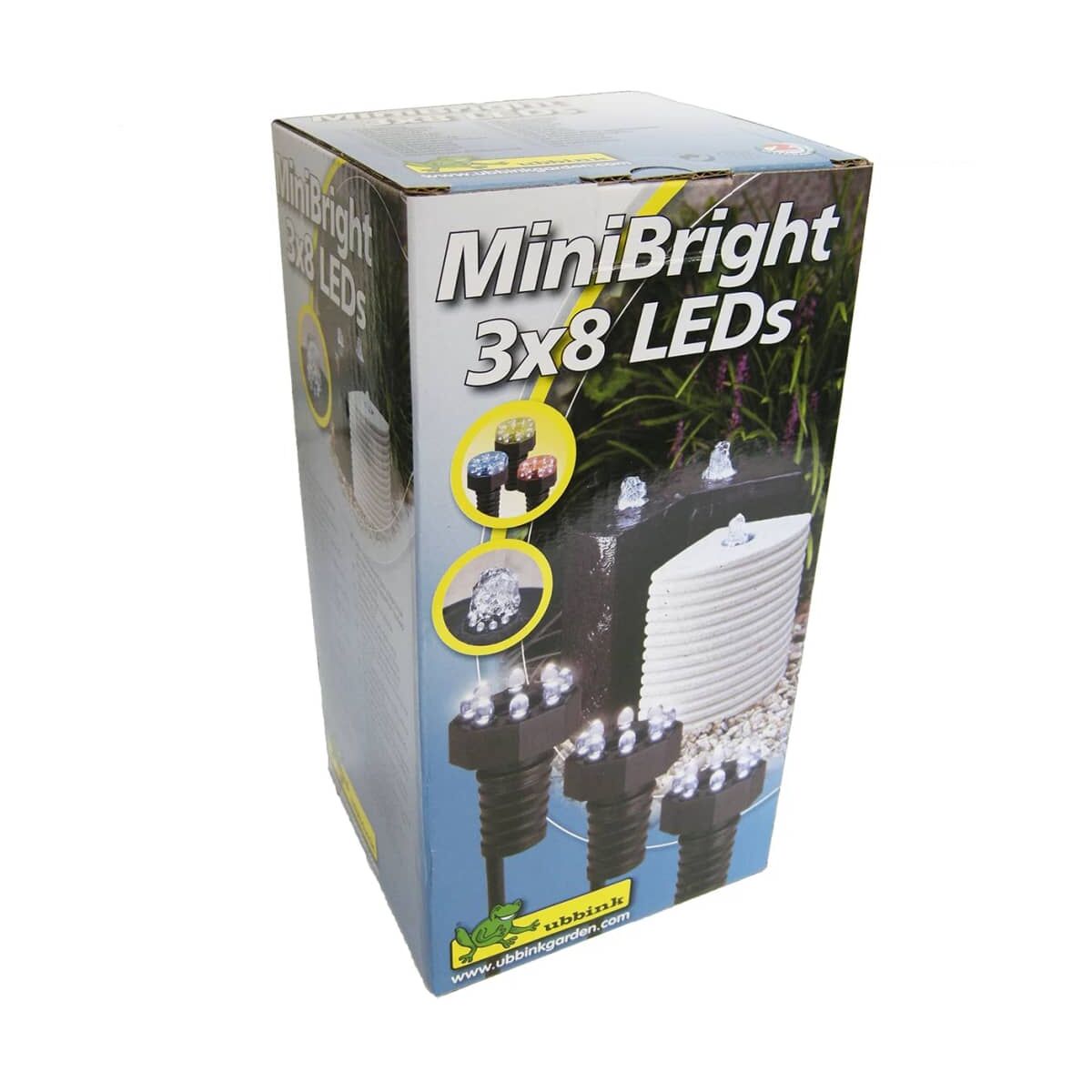 Mini Bright 3*8 LED tavi lámpa, kizárólag vízben használható. Kiválóan alkalmas szökőkutak, vízesések megvilágítására. Törpefeszültségű 12 V-os rendszerben működik. A LED lámpatesthez tartozó 5 m kábel rugalmas elhelyezést tesz lehetővé. A csomagban található színtárcsák ( piros, sárga, kék) használatával különböző színhatást érhet el. A tavi lámpa működtetéséhez szükséges transzformátort a csomag tartalmazza. LED-es világítási rendszer előnyei: A termékcsalád 12V-os törpefeszültségről üzemeltetett LED lámpáival 90%-os az energia megtakarítás, és jóval nagyobb az élettartam, így minimum 30.000óra érhető el a hagyományos 220V-os izzókhoz képest. A rendszer telepítése rendkívül egyszerű. Minden lámpa, gumiszigetelésű vezetékkel szerelt. A lámpákat egyszerűen minden speciális szaktudás nélkül csatlakoztathatjuk a rendszer részét képező elosztókhoz, transzformátorokhoz. A rendszer összes eleme, csatlakozók, transzformátorok teljesen vízállóak. Minden termék rendelkezik TÜV minősítéssel. Biztonságos 12V alacsony feszültség. Dekoratív (cserélhető színek, , modern design). Energia takarékos: Legnagyobb előnyük az energia takarékosság. Működésük során a fény kibocsátását nem fémszál felmelegedéséből, izzásából érik el, hanem elektronok szabadulnak fel, így nincsen hőveszteségük. Akár 90% energia megtakarítás érhető el a hagyományos izzókhoz képest. Fény hasznosítása:A hagyományos izzók az áram nagy részét melegítésre használják, míg a led lámpák fénnyé alakítják. Hőtermelés:Hőtermelésük minimális, kiválóan alkalmazhatóak olyan helyeken is ahol a melegedés veszélyforrás lehet. Élettartam: hagyományos izzók kb 1000 üzemórát bírnak, még a LED lámpák élettartama 30.000-100.000 óra.