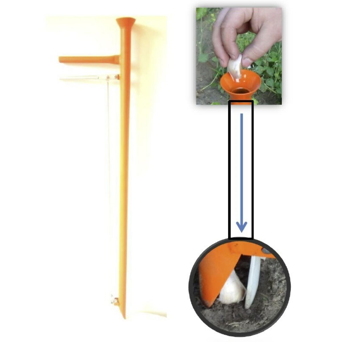 HASZNÁLATA A készüléket a kívánt mélységre az előkészített talajba kell szúrni, majd egy szemet a vetendő hagymából, illetve nagyobb szemű magból a csőbe kell ejteni. Ezután az alsó kart felhúzva kinyílik a cső földben lévő vége, a benne lévő mag, vagy hagyma a magárok aljára kerül. Ezzel egy időben - nyitott állapotban - kihúzzuk a csövet a földből. Amennyiben a föld nem kellő mértékben takarja be az elvetett hagymát, utólagos egyengetés szükséges. A készülékhez tartozék egy tő-, vagy sortávolság jelzéséhez használható pálca, amit a bot alsó végének közelében egy csavarral lehet rögzíteni.