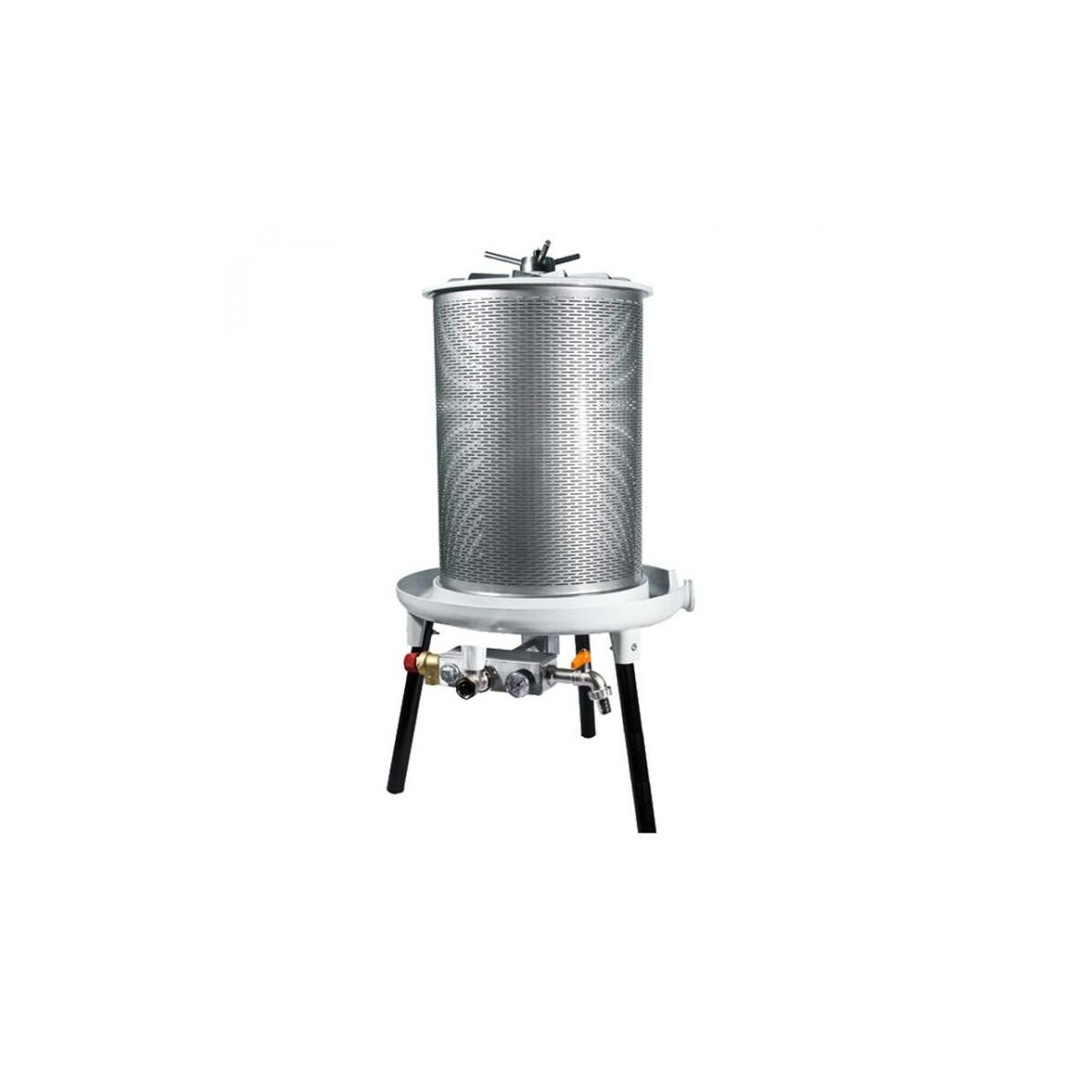 Grifo gyártású professzionális (hidraulikus) víznyomásos szőlőprés és gyümölcsprés. Tegyük a préselni kívánt szőlőt vagy gyümölcsöt a magvédő hálóval kibélelt préskosárba, majd rögzítsük a fedelet. Helyezzük a prést víznyomás alá. A kosárban elhelyezett gumi membrán a víznyomás végett ki tágul és megkezdődik a préselési folyamat. A víznyomás maximum 3 Bar lehet, ezért figyelje nyomásszabályzót, hogy ne haladja meg. A nagyobb léhozam érdekében, a préselést ismételjük meg. Kitűnő megoldás szőlő, darált alma, ribizli, paradicsom és egyéb nem csonthéjas gyümölcs kipréselésére. A lé gyűjtőt és a zsákban összegyűlt seprűt használat után ki kell üríteni, majd vízteleníteni.